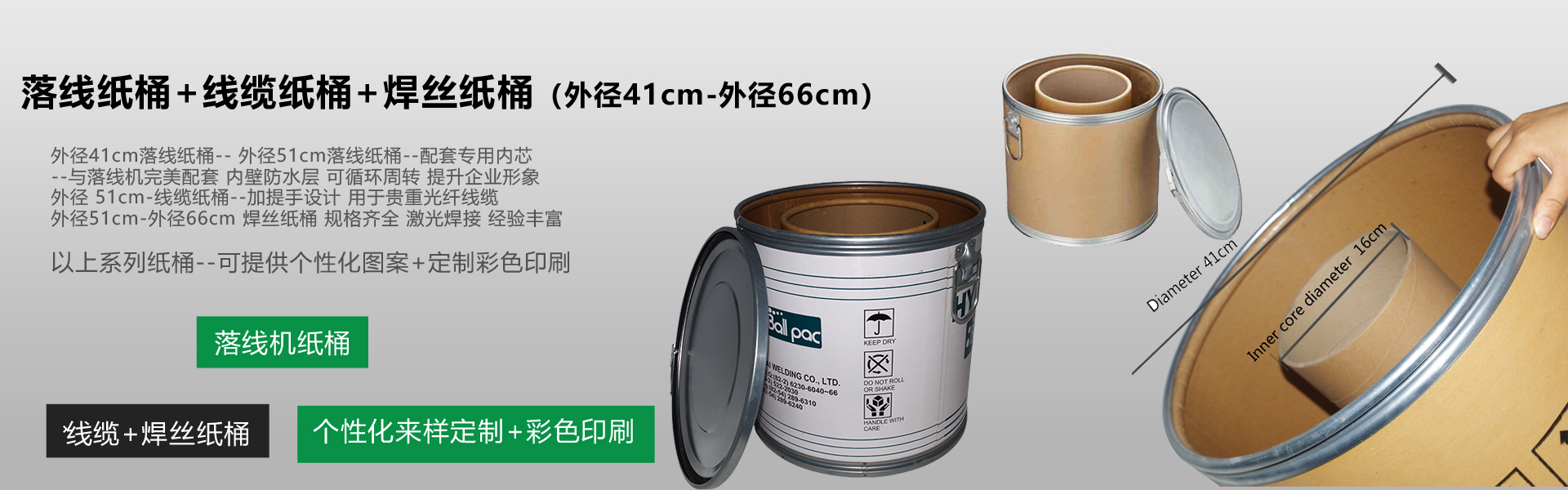 南京盛江包裝有限公司,9年致力于:紙桶,紙板桶,線纜桶,焊線桶,方紙桶,密實紙箱,全紙桶,pur紙桶,直徑28-66cm,高度30-110cm,可滿足不同客戶的定制需求。我們產品種類齊全,質量過硬,廣泛用于電線電纜,焊絲,化工、醫(yī)藥、食品添加劑類的包裝。公司占地面積2500平方米,其中建筑面積1800平方米。公司引進國外自動化生產設備,年生產量80多萬只。致力于根據客戶具體要求、量身定做各種規(guī)格的...